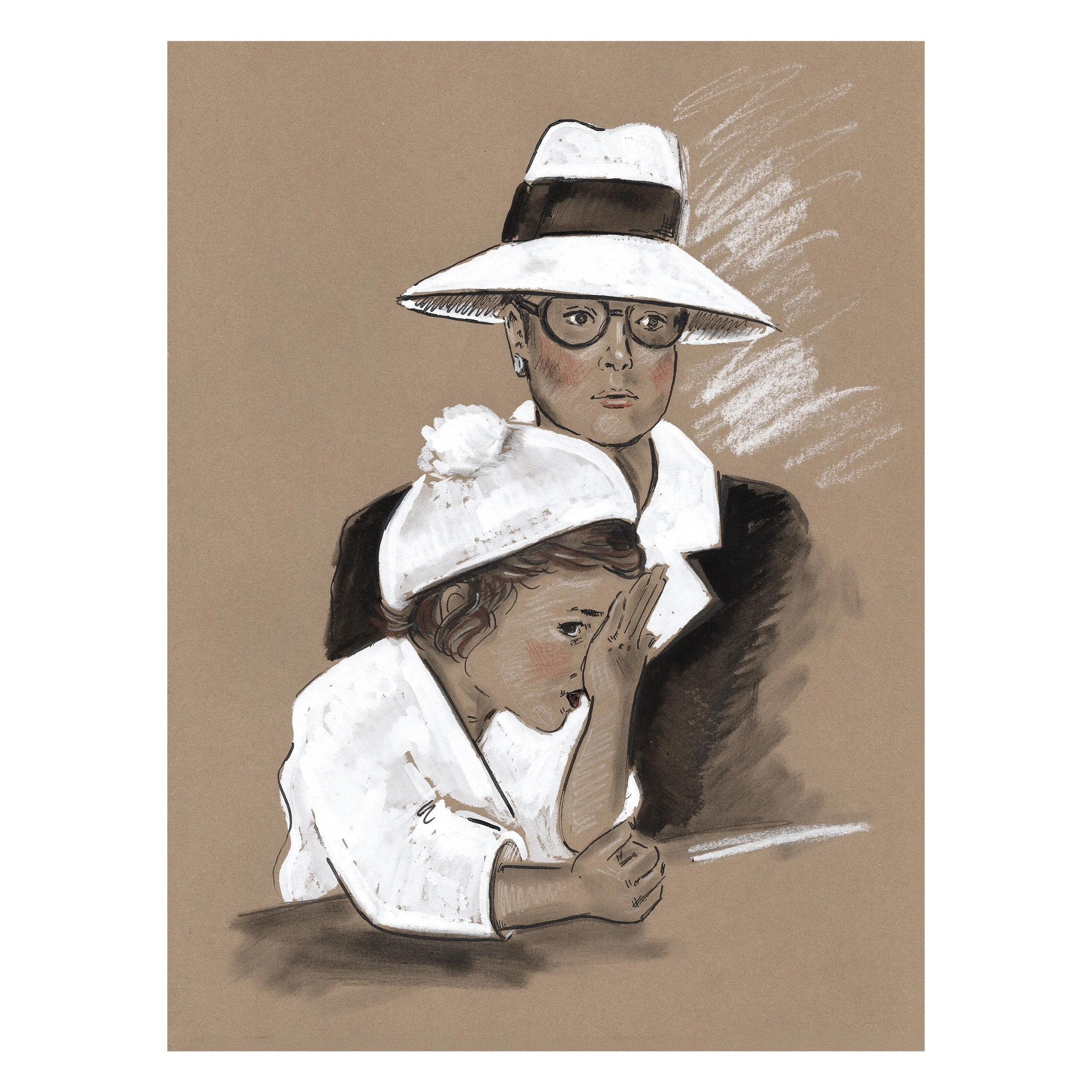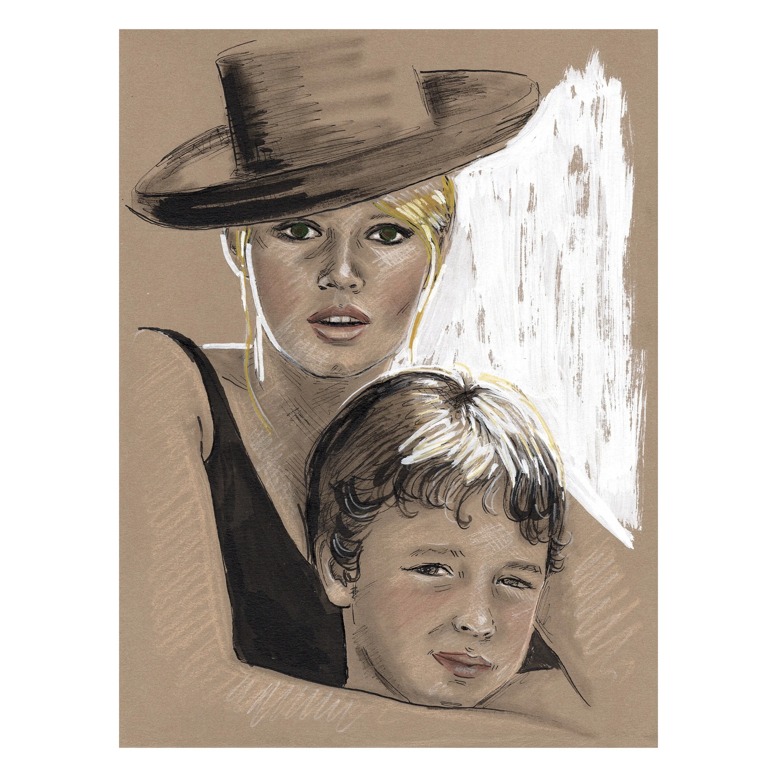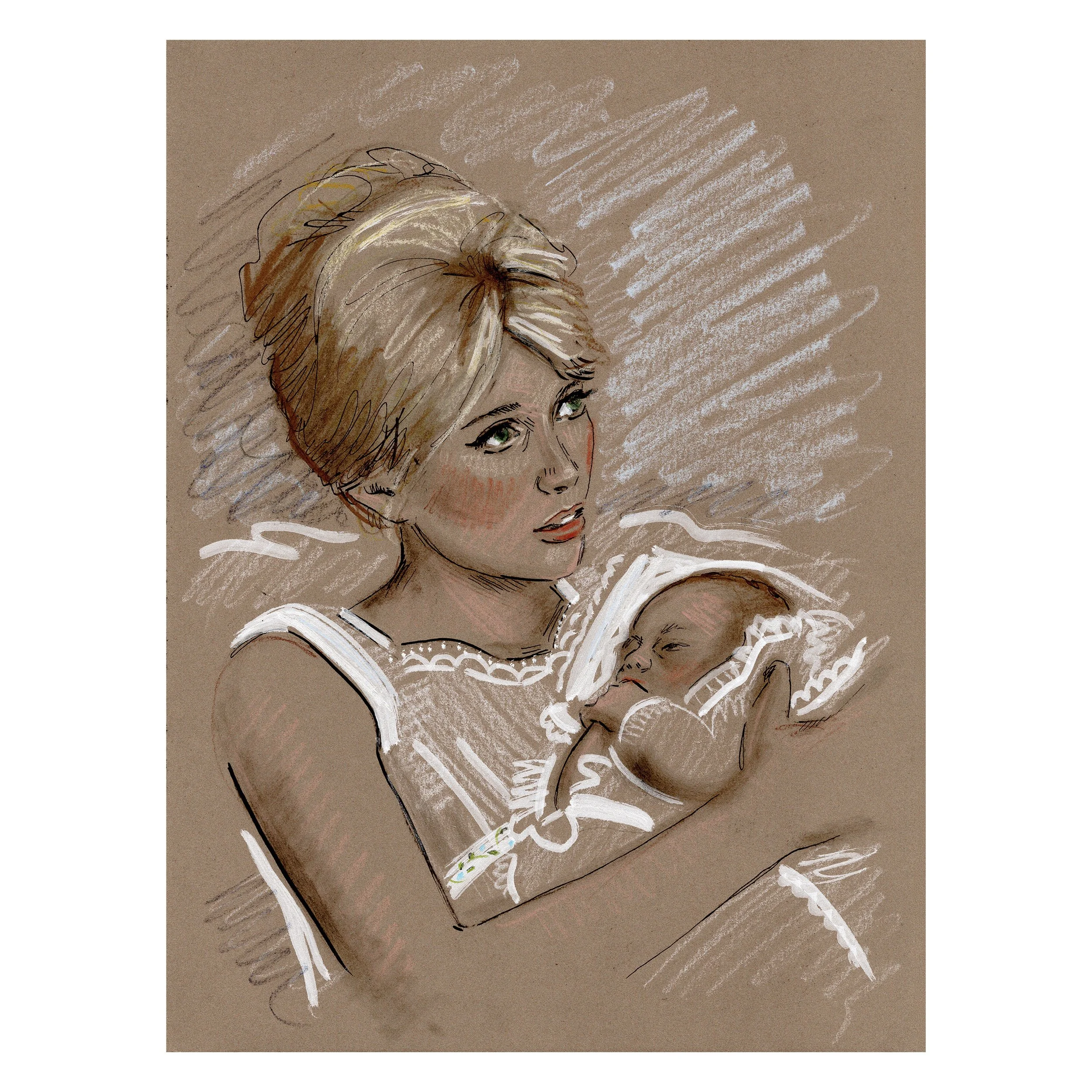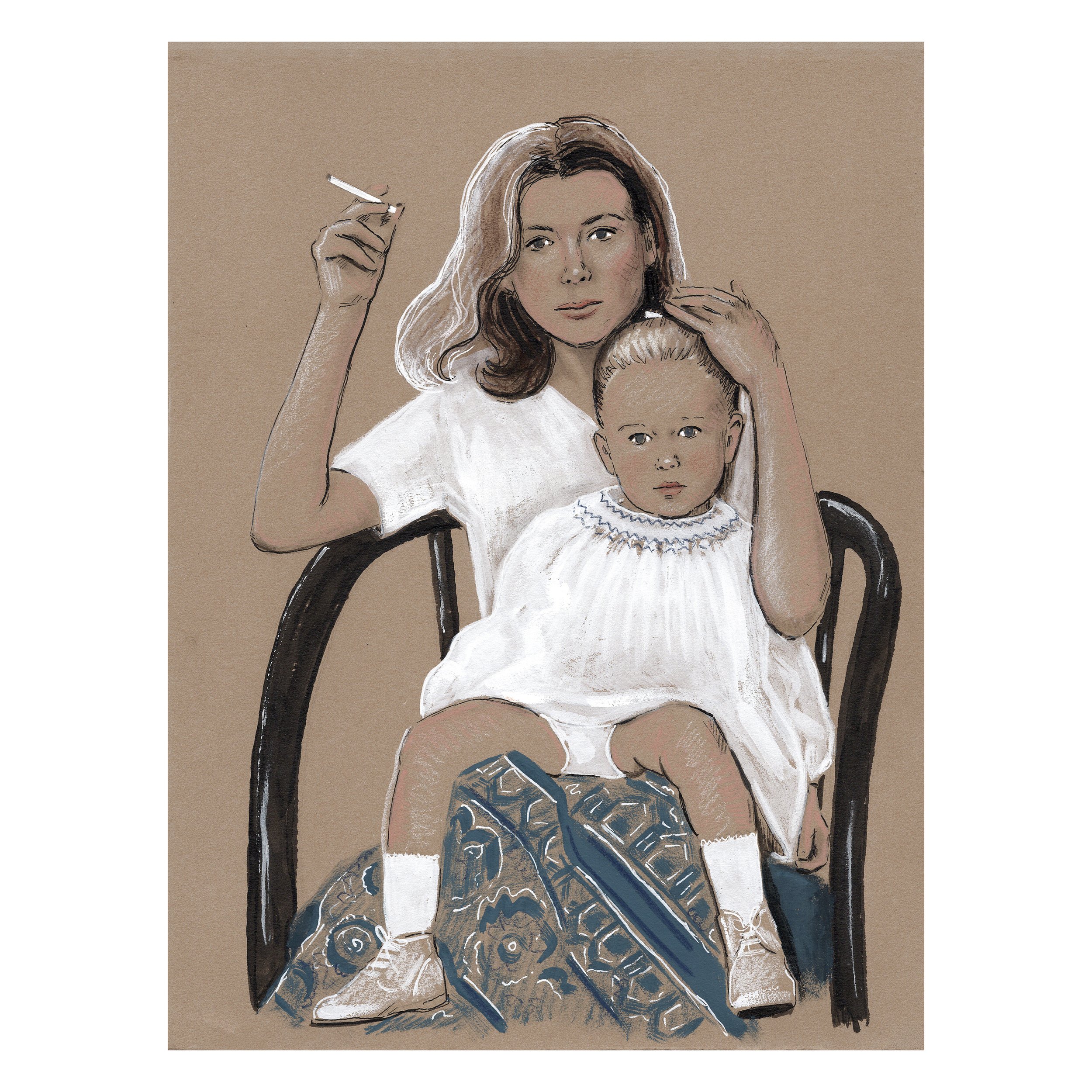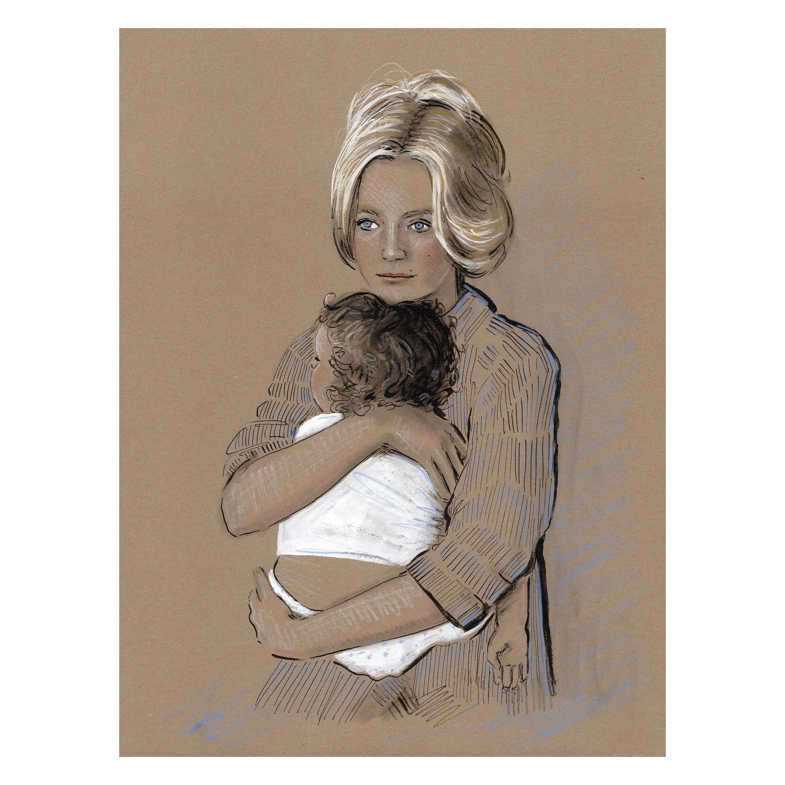 The Iconic Moms drawings, created in mixed media on toned cotton paper, reference my background in fashion illustration through bold ink linework, graphic gouache, and textural elements of chalk and pastel.  Each drawing features a unique blend of media, capturing the layered experience of motherhood.