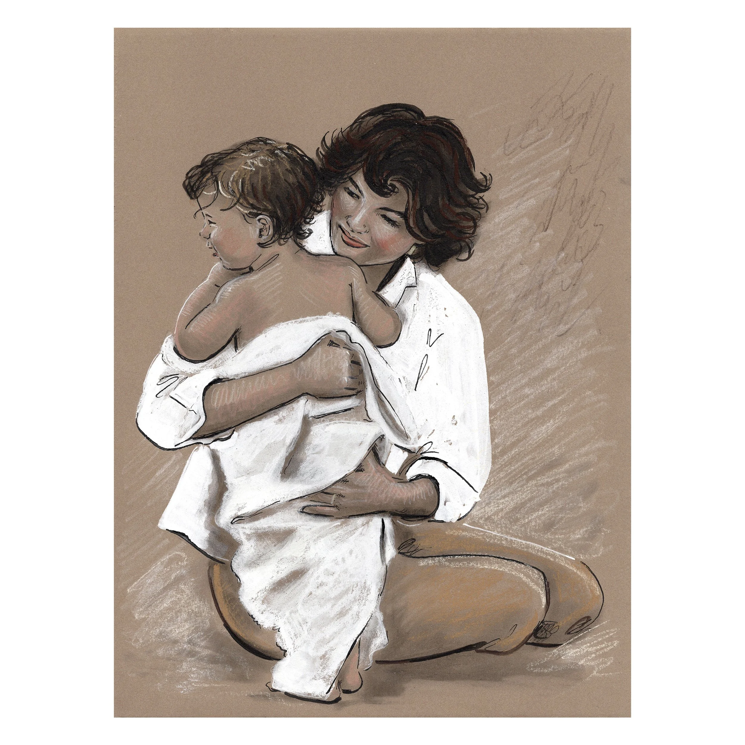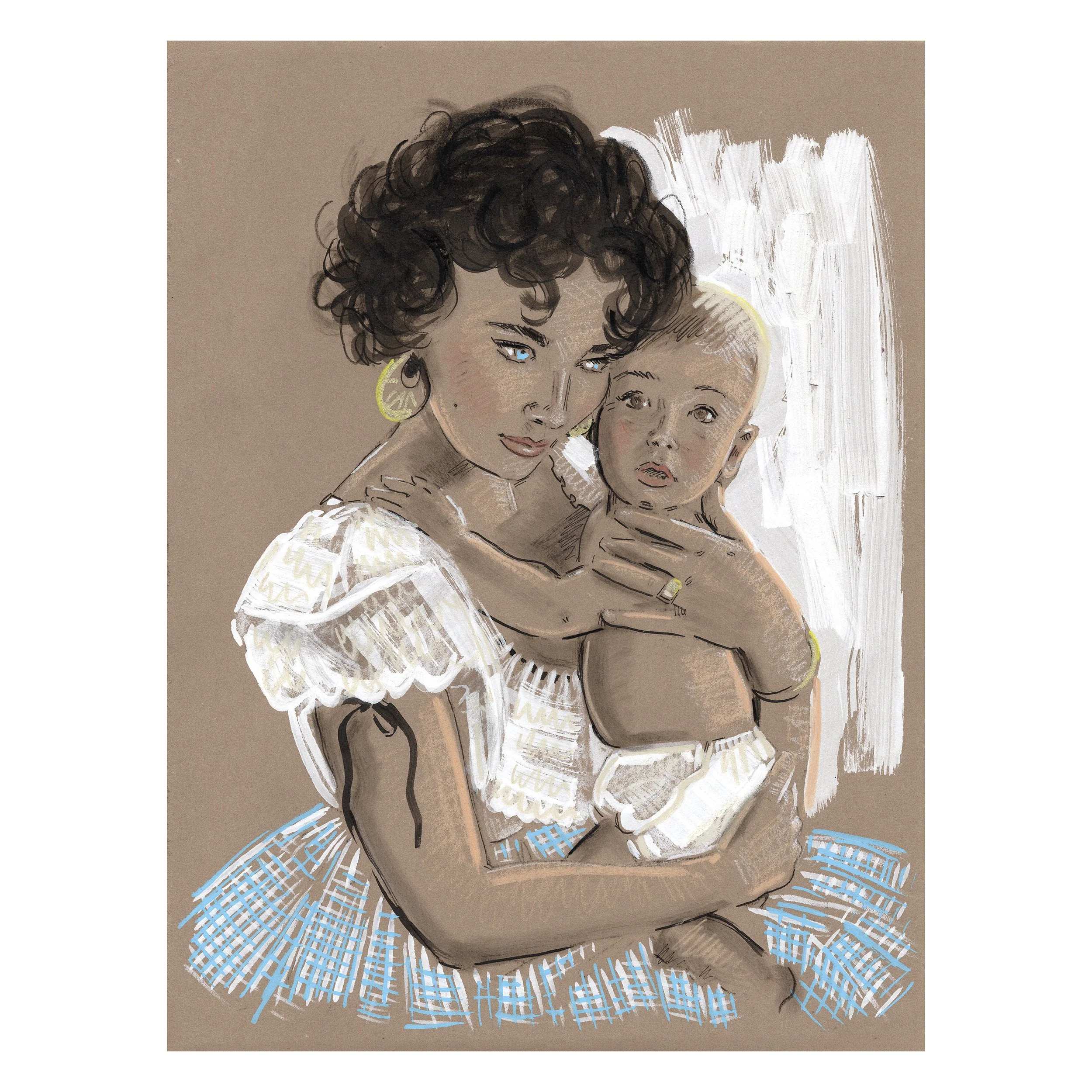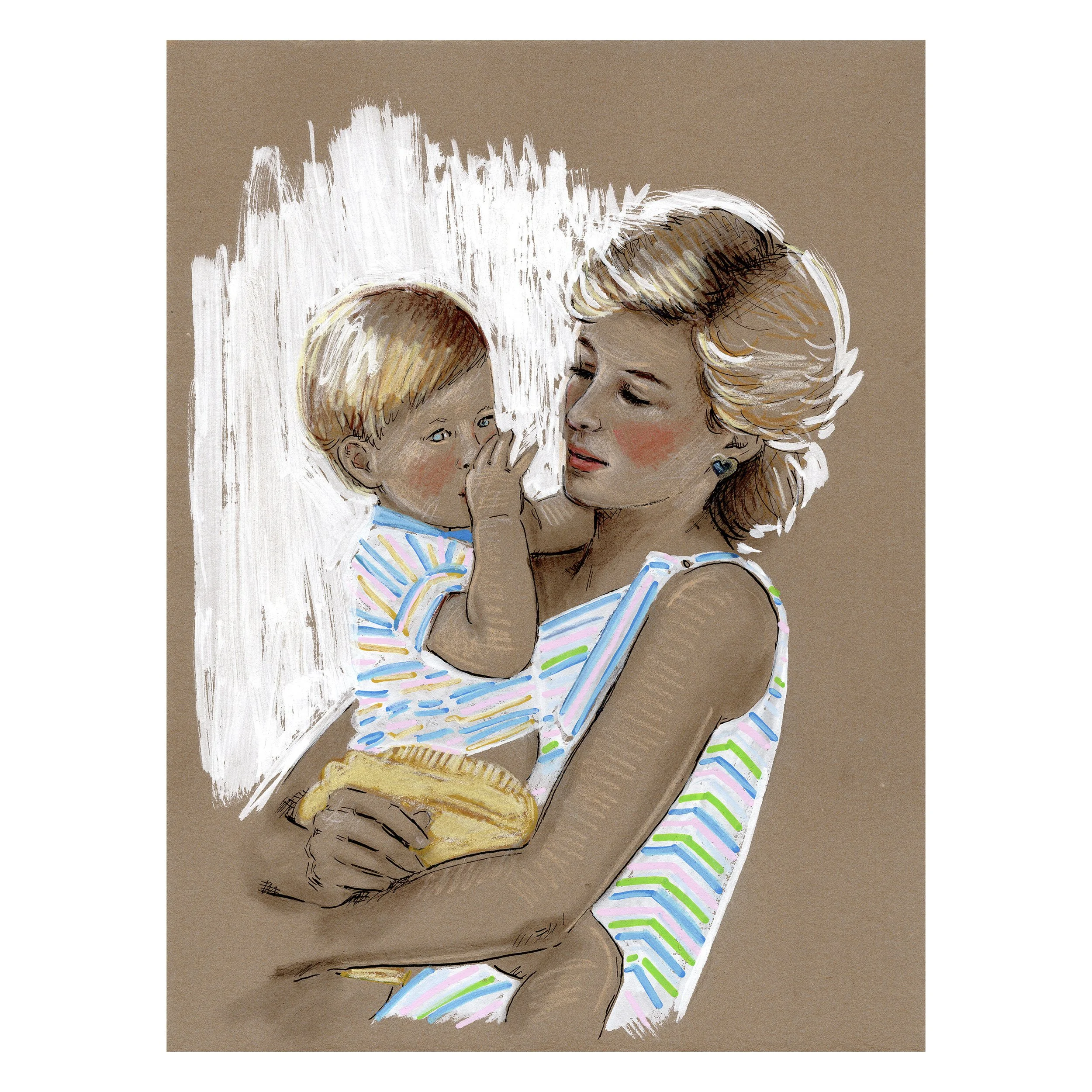 The Iconic Moms series is inspired by the same reason I enjoy creating any mother-and-child pieces.  It's not about idolizing someone's mothering.  I have no idea what kind of moms these women were or are, but I do find images of parents with their children among the most vulnerable and honest insights into human experience. When you are with your child, you must leave a public persona behind.  I love seeing someone who is otherwise stoic and serious enjoying a candid moment, or someone who is seen as an icon or untouchable, and knowing they were touched with love.  I reimagine these iconic images and attempt to hone in on something real.  I never have a plan when I begin these and just feel my way through the story and relay it in a way that feels inspiring.