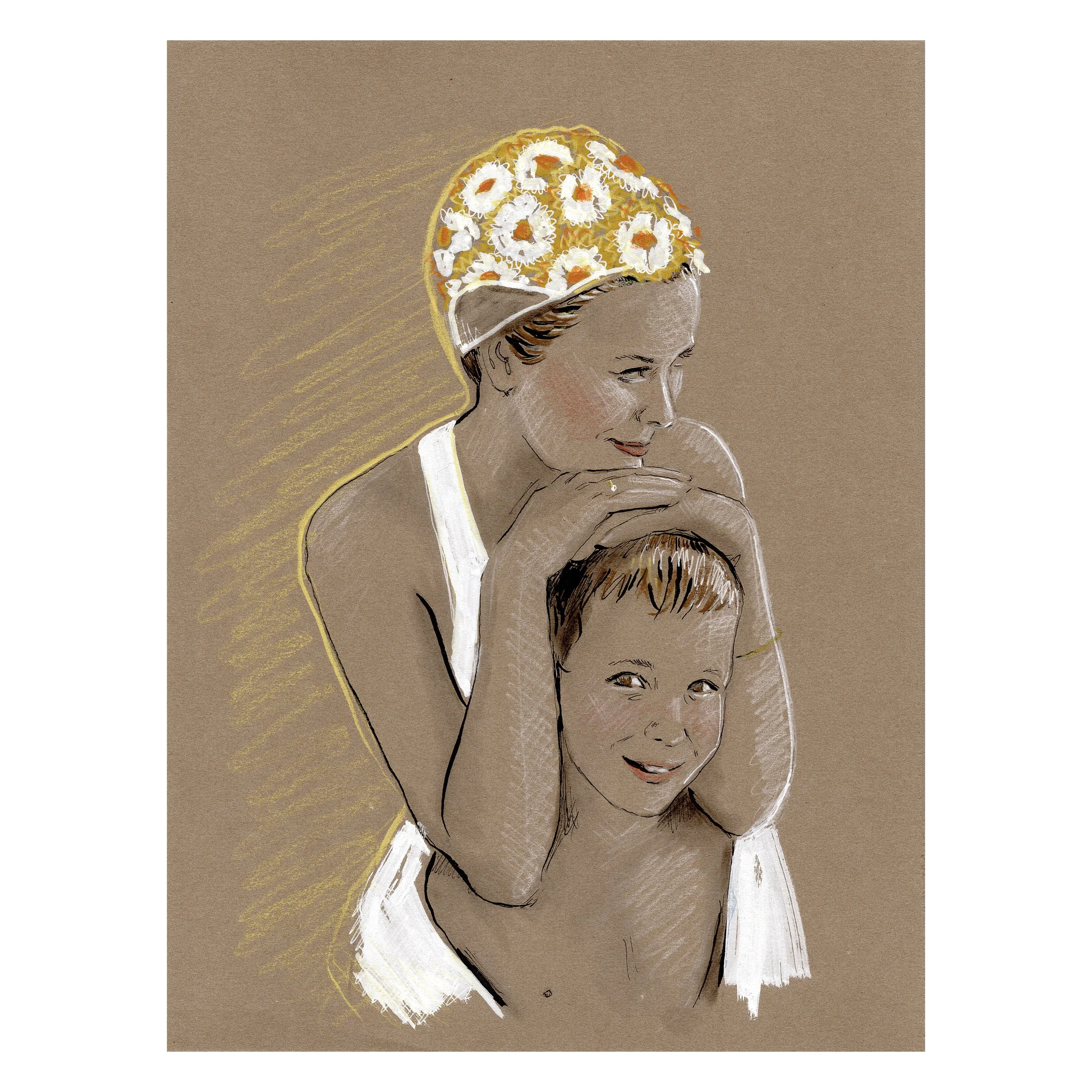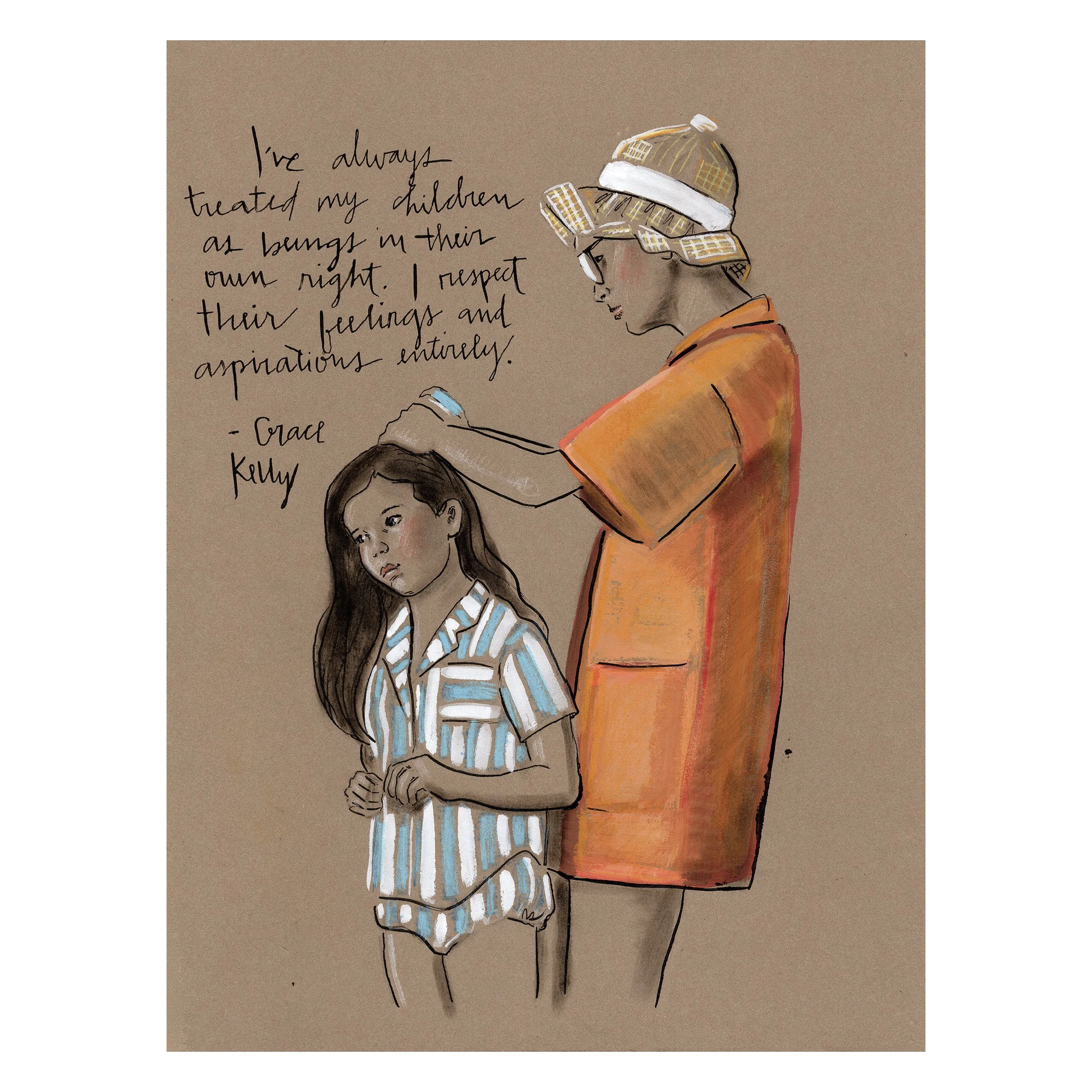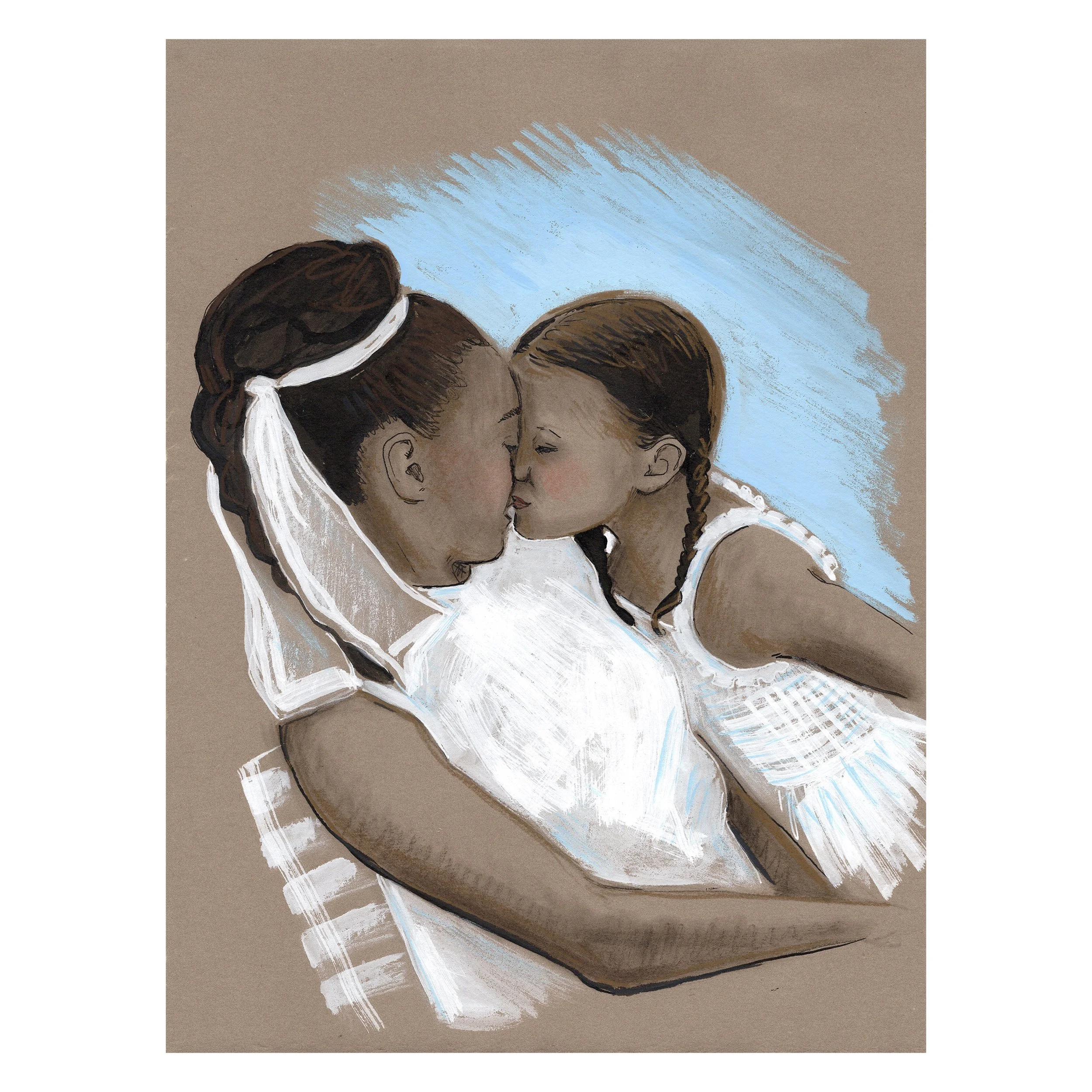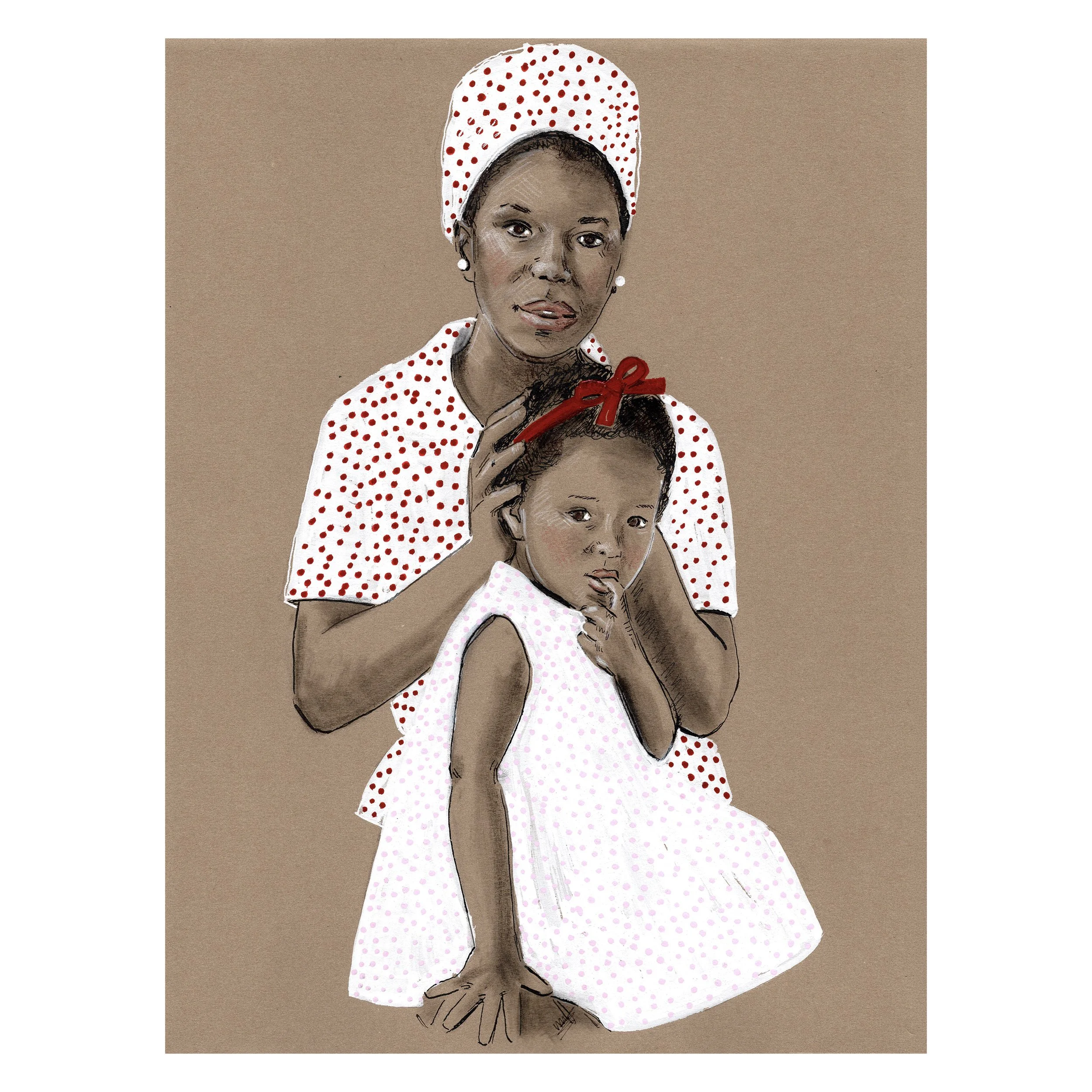 The Iconic Moms series is inspired by the same reason I enjoy creating any mother-and-child pieces.  It's not about idolizing someone's mothering.  I have no idea what kind of moms these women were or are, but I do find images of parents with their children among the most vulnerable and honest insights into human experience. When you are with your child, you must leave a public persona behind.  I love seeing someone who is otherwise stoic and serious enjoying a candid moment, or someone who is seen as an icon or untouchable, and knowing they were touched with love.  I reimagine these iconic images and attempt to hone in on something real.  I never have a plan when I begin these and just feel my way through the story and relay it in a way that feels inspiring.